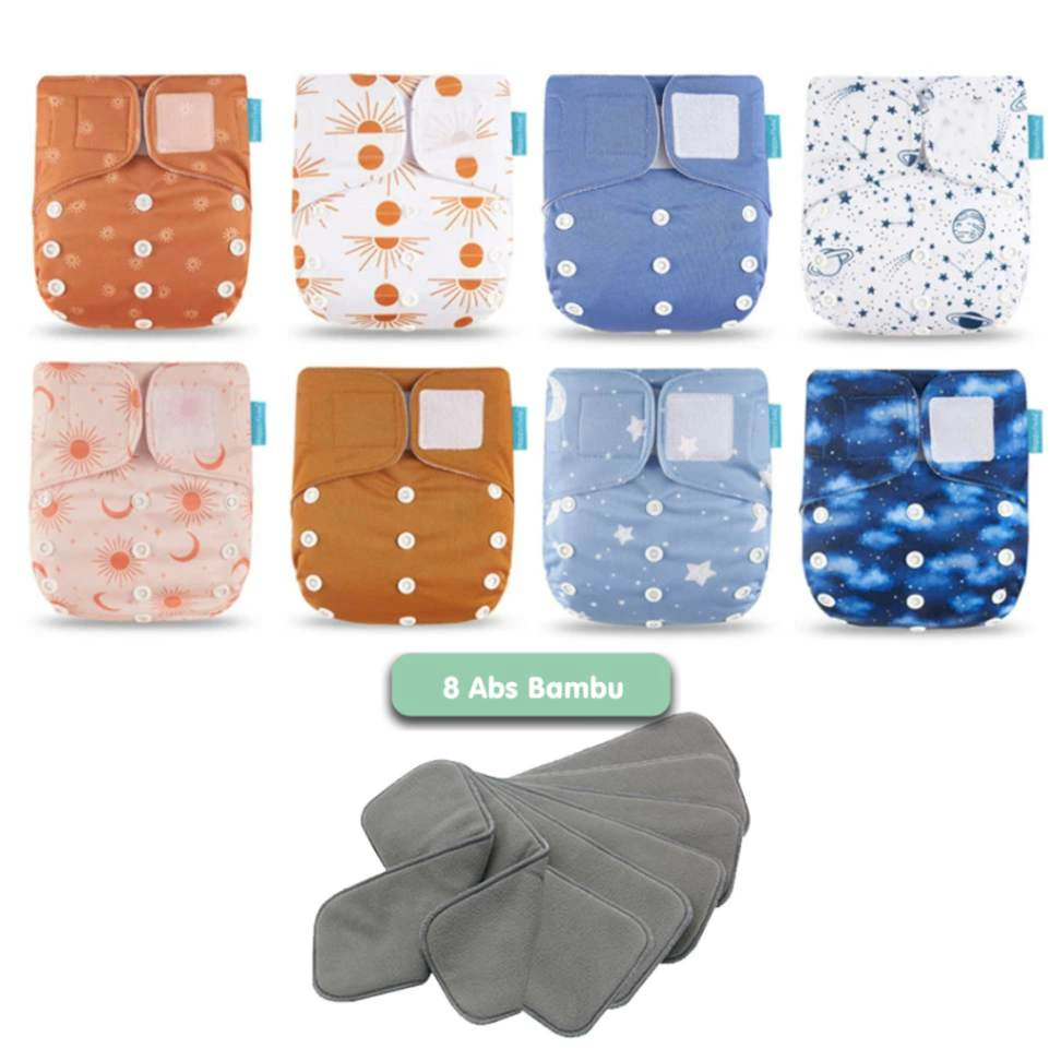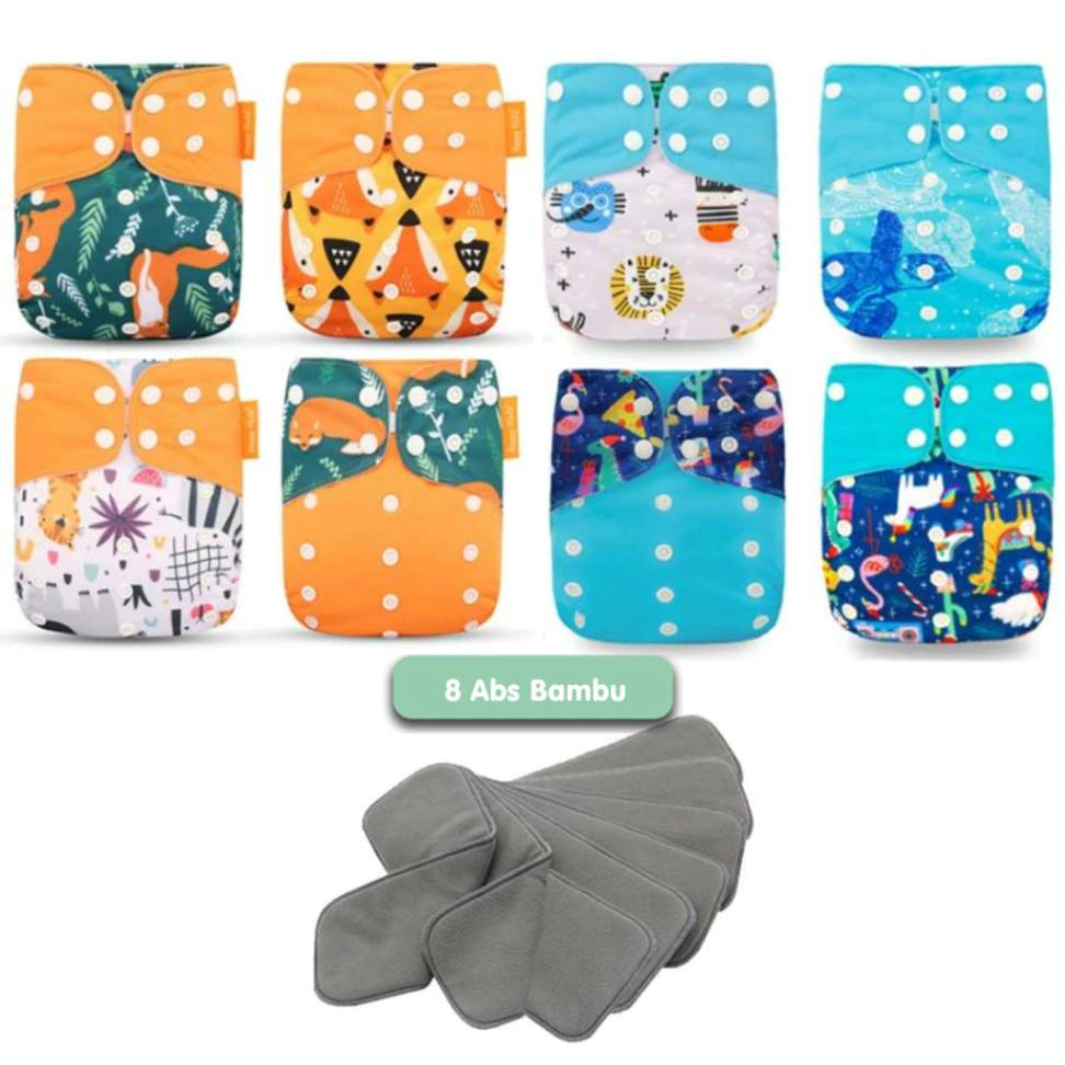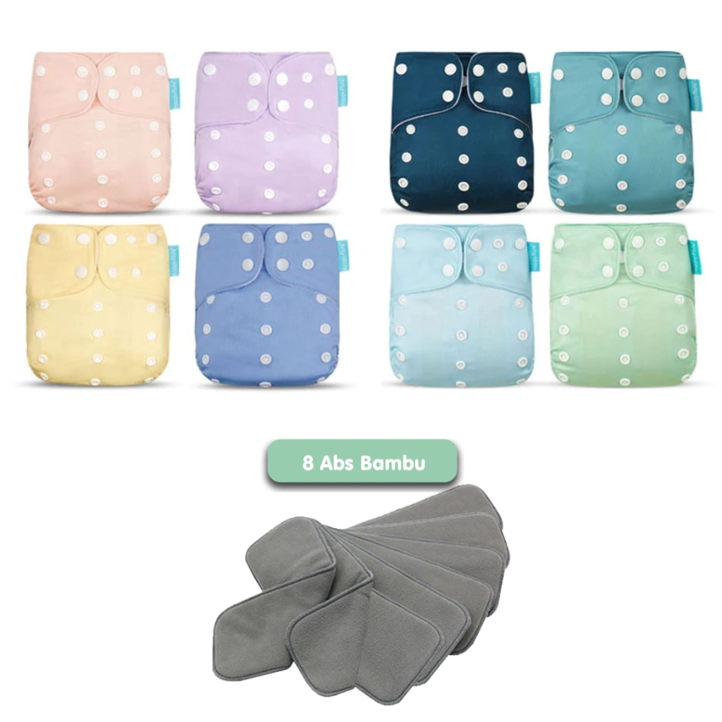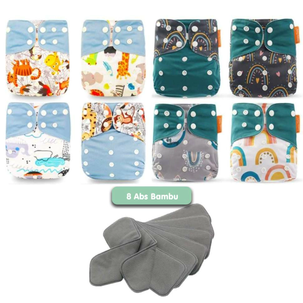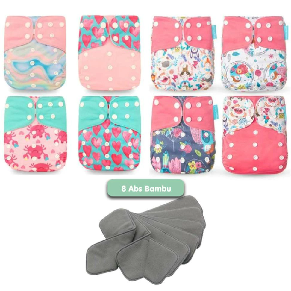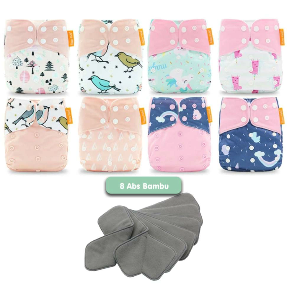 Kit 8 Fraldas Ecológicas Happy Flute Estampa + 8 Absorventes de Fibra de Carvão de Bambu, possui toque seco e pode ter contato direto com a pele do bebê.